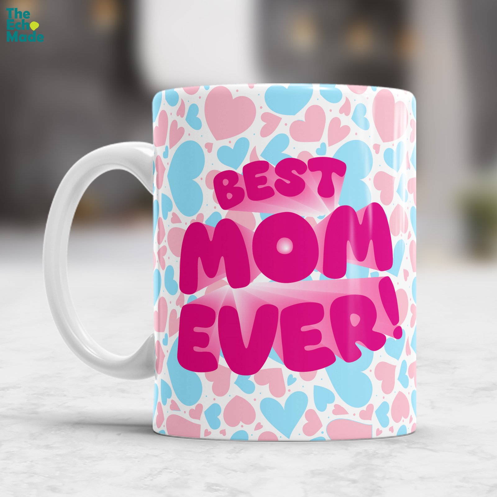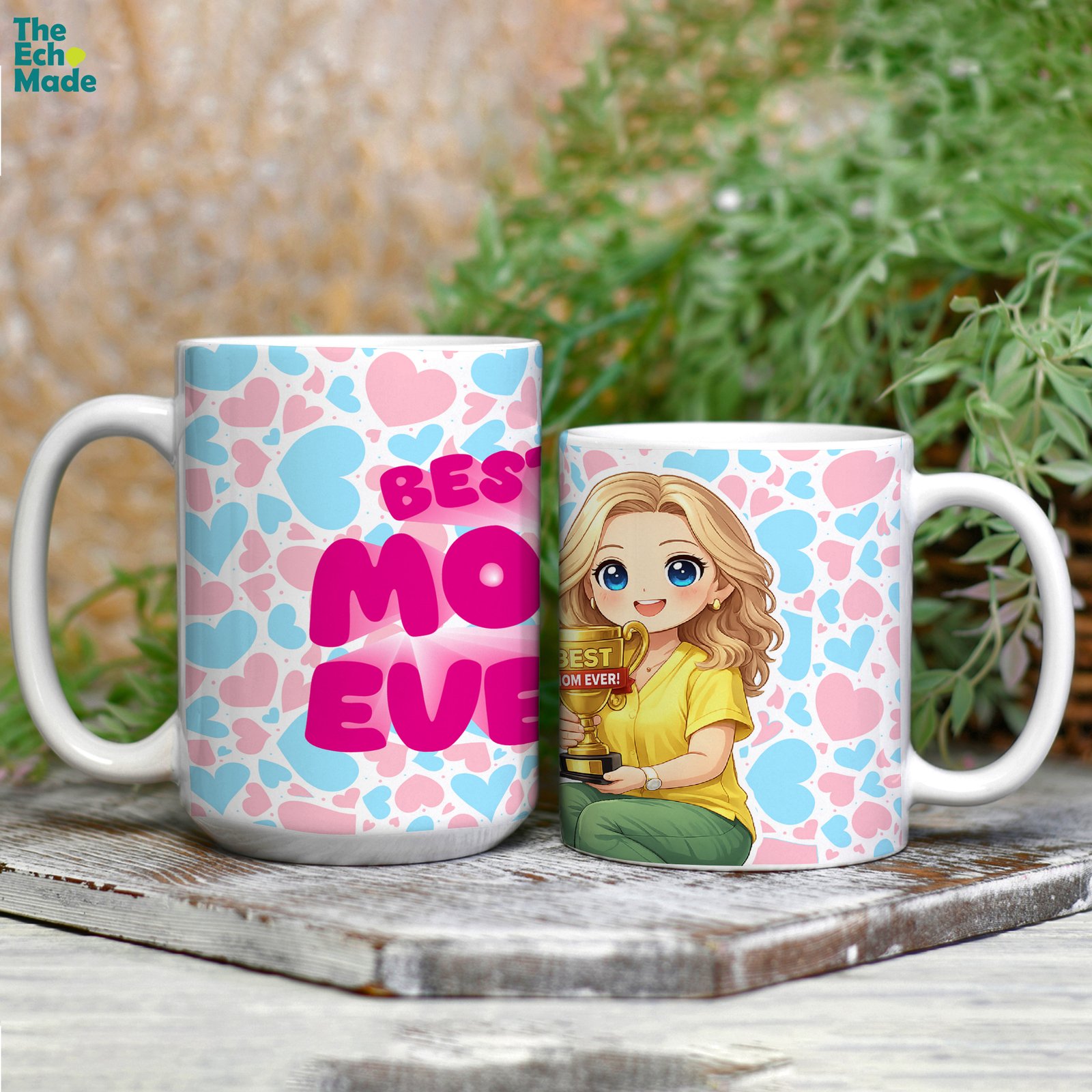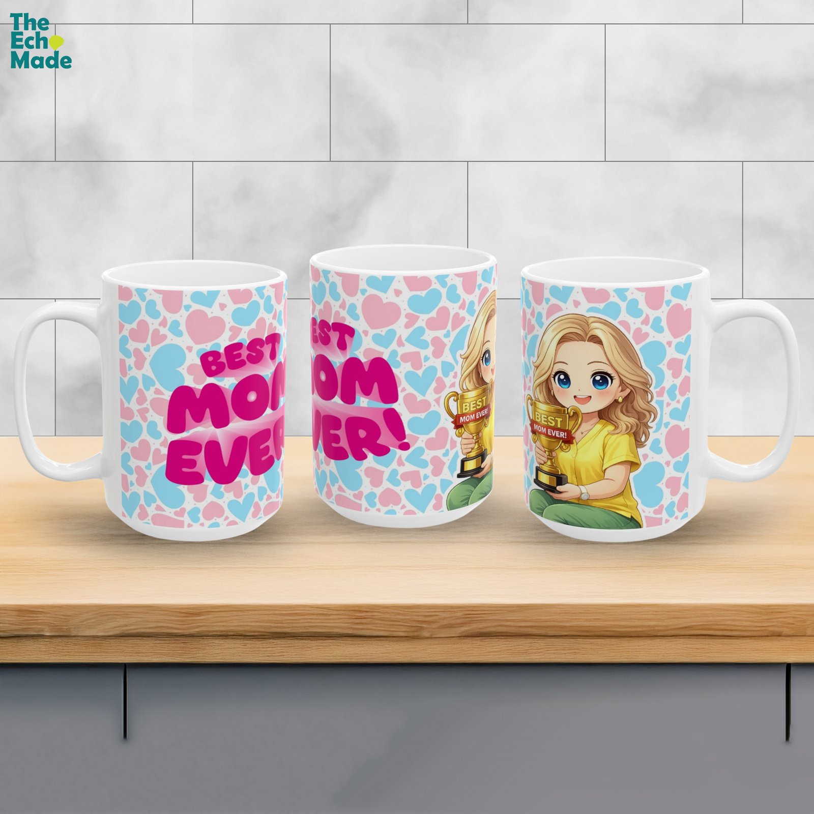 She’s been there for every milestone, every tough day, and every reason to celebrate — now it’s her turn to feel like the champion she is. The Best Mom Ever ceramic mug features a charming anime-style cartoon illustration of mom proudly holding her golden trophy, surrounded by a colorful pink and blue heart pattern that wraps all the way around.