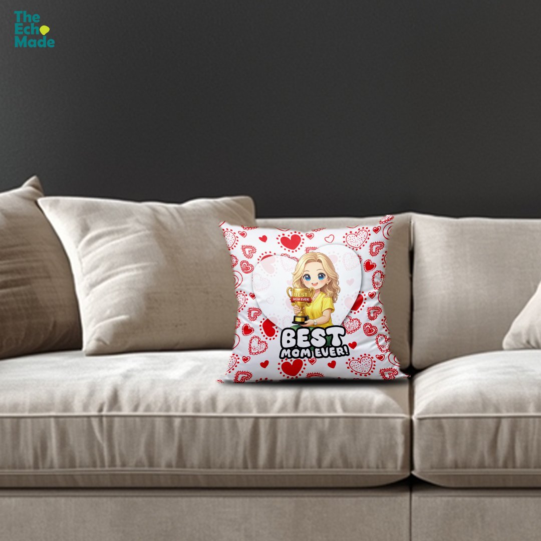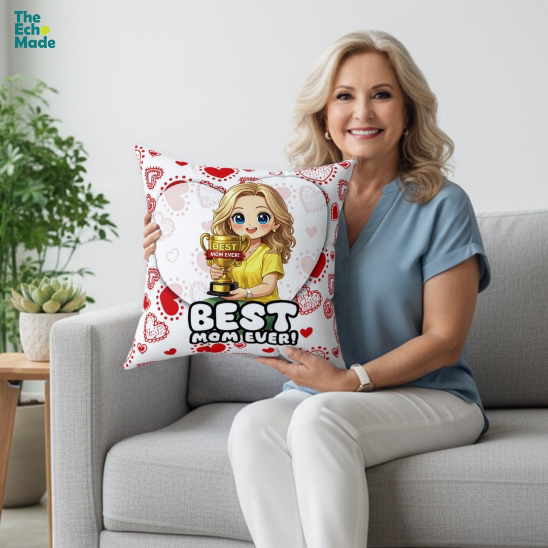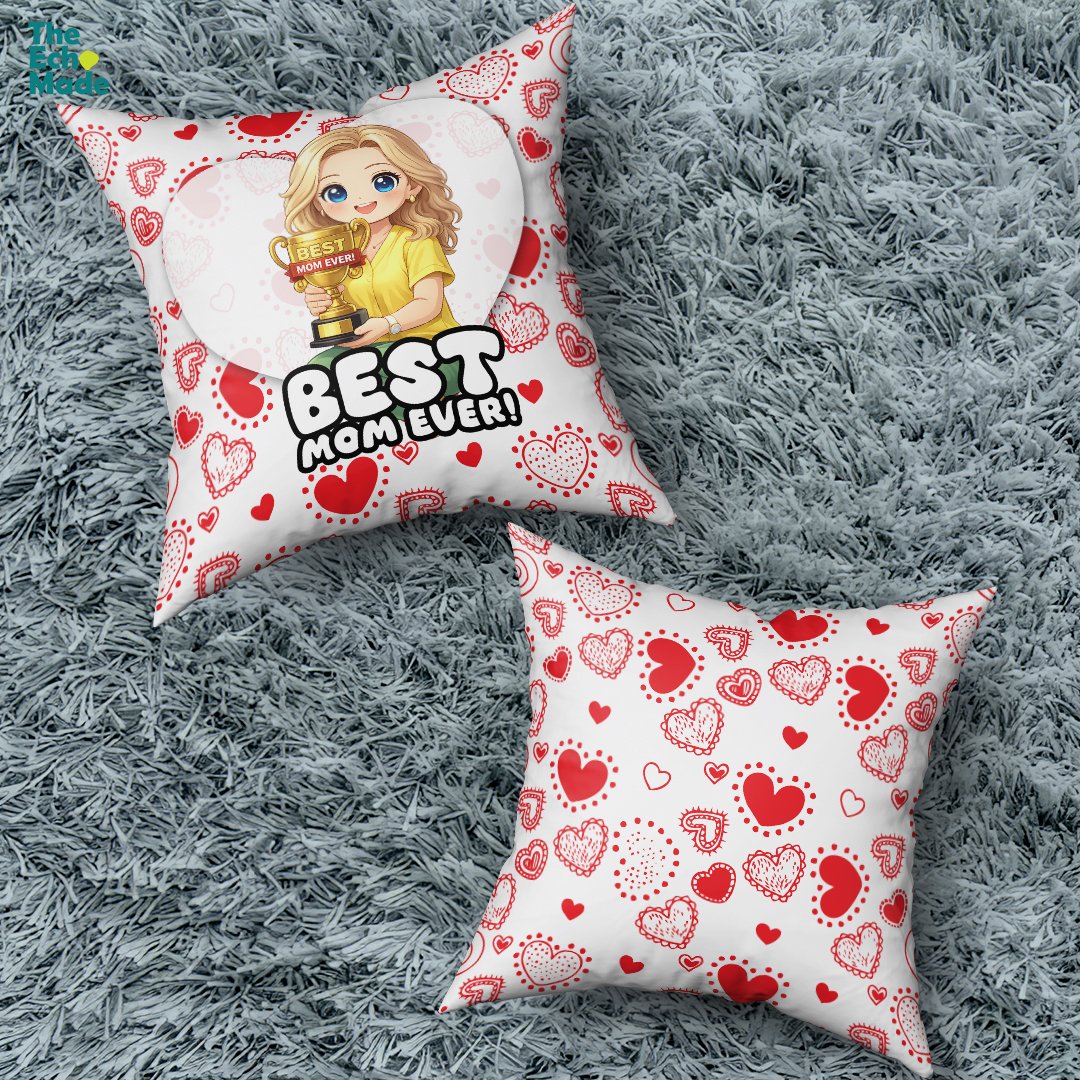 This Mother’s Day, skip the ordinary and give her something she’ll treasure forever. The Best Mom Ever Pillow is a personalized square pillow featuring a custom cartoon-style illustration of mom — complete with a golden trophy, a heart-filled background, and all the love you can fit into a gift.